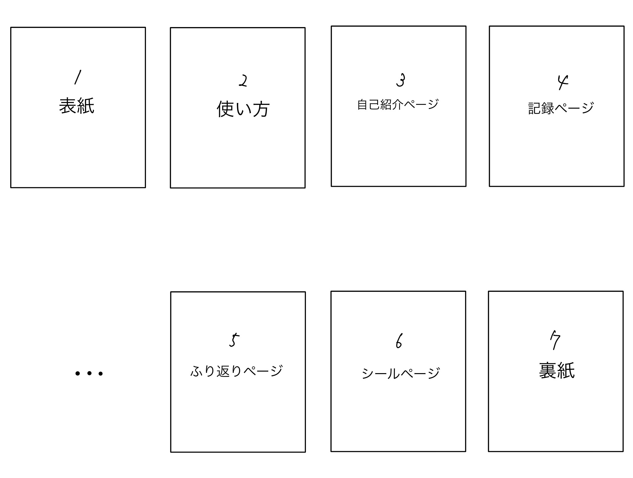 ページの構成 表紙、使い方ガイド、自己紹介ページ、毎日記録ページ、ご褒美シールシート