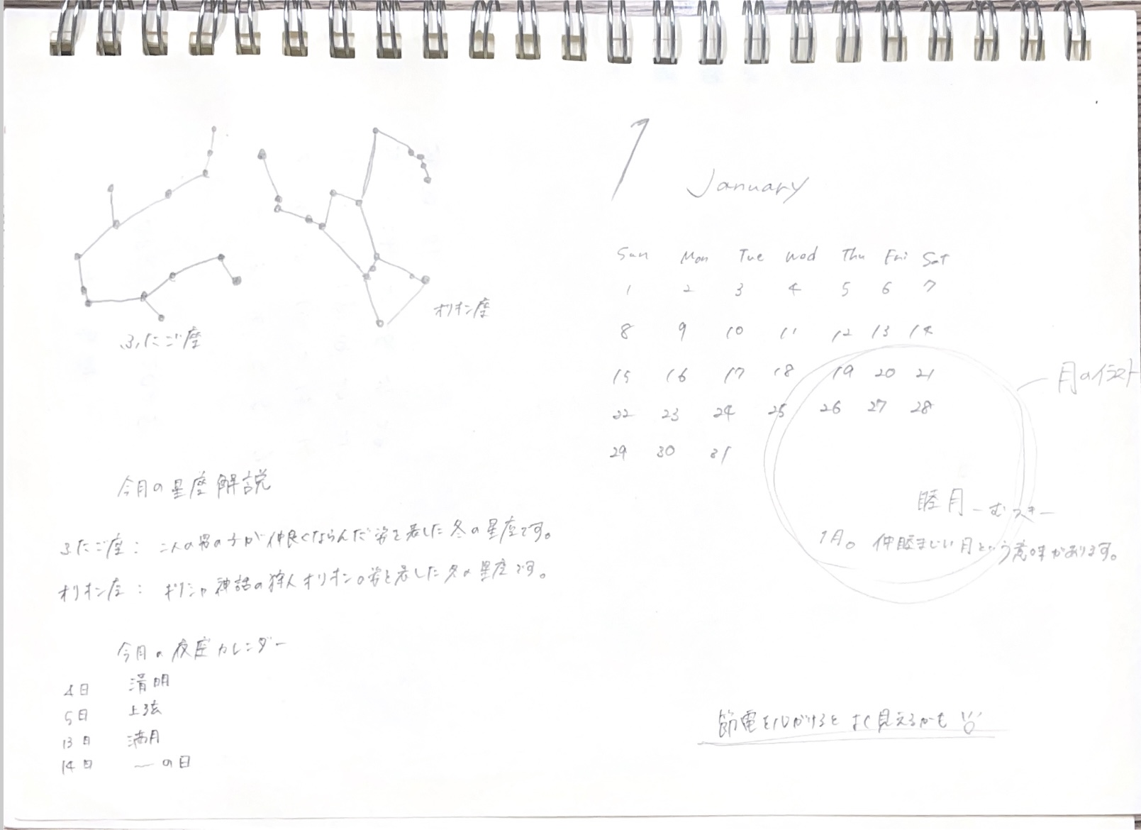 制作の過程では、背景色や星座の大きさなどを試行錯誤し、最終的に、視覚的な美しさと扱いやすさの両立を目指したカレンダーに仕上げることができたと思う。