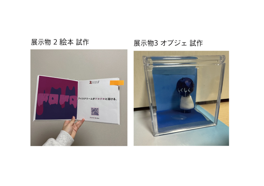 紙粘土等で作ったオブジェを展示。展示が華やかになる+物体によってテクスチャを見せることで更に視覚的に意味を伝えることにつなげる