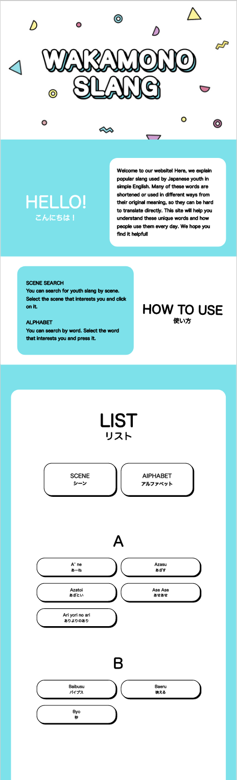 このような現状から、若者の間で流行している言葉を英語で表現したWEBサイトを制作するを決めた。このサイトをきっかけに若者言葉に込められている意味を外国人に教えることができ、外国人とのコミュニケーション向上を図ることができるのではないかと考えた。