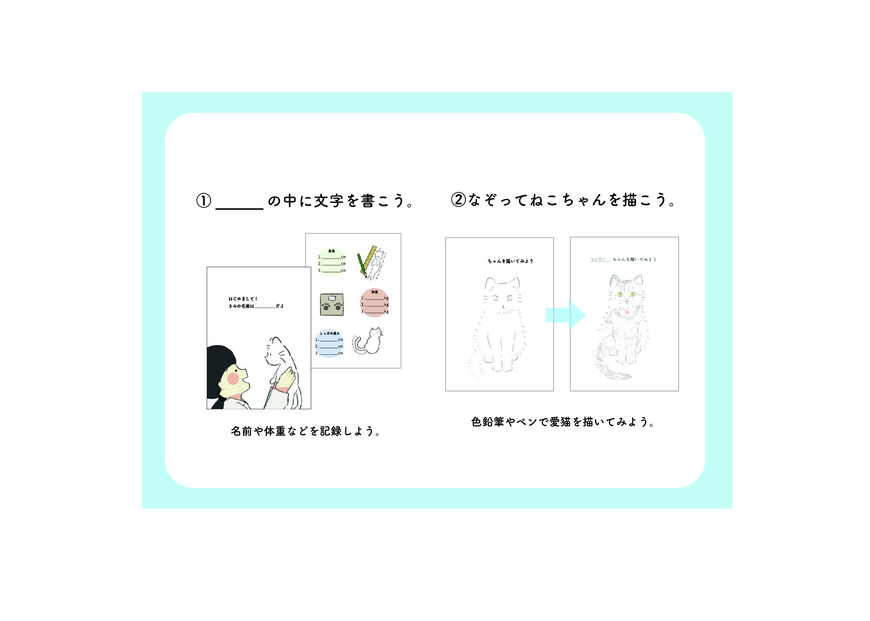 - 猫の大きさやしっぽの形、色などが違う▶︎色鉛筆などで描いたり塗ったりしてもらう。書き込み要素の高い本にする。(その子について考える時間が思い出になるはず...)
