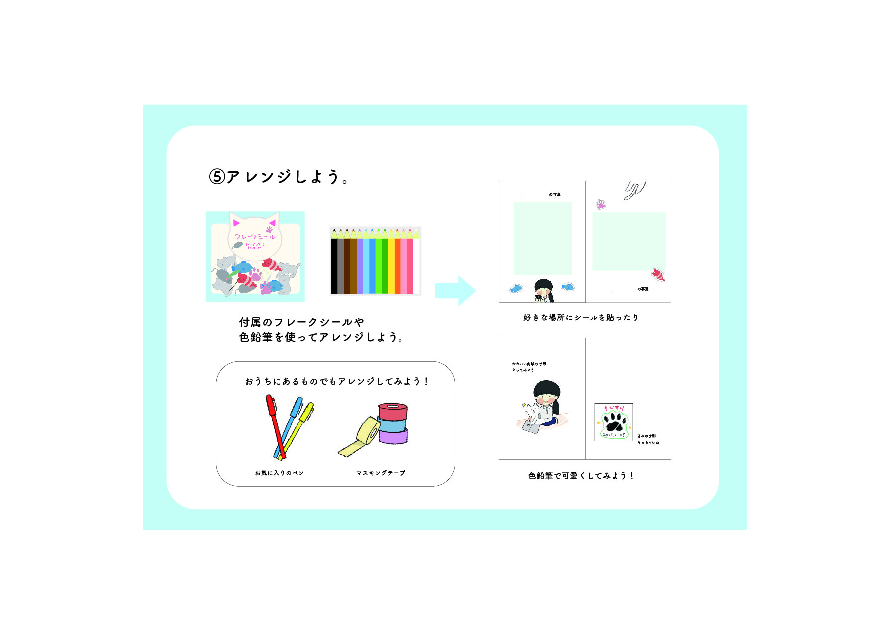 - 余白を多く作ることで自由に書き込め、デコレーションなどを行い、世界で一冊となるアルバムを作る。
