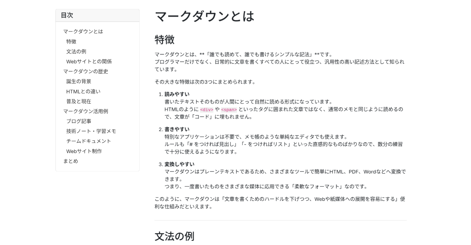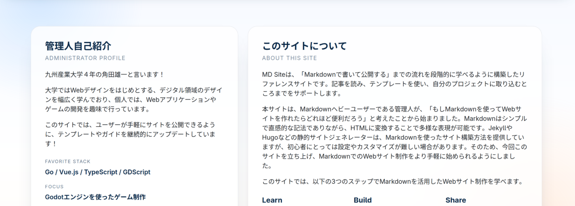 本サイトは、Markdown形式で記事を管理し、JavaScriptでHTMLに変換し、GitHub Pagesで公開するという、無料でビルド不要のWebサイト制作手法を解説するドキュメントサイトである。