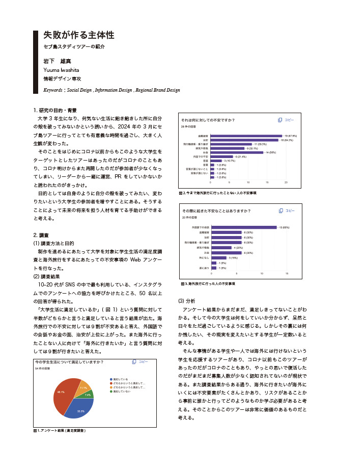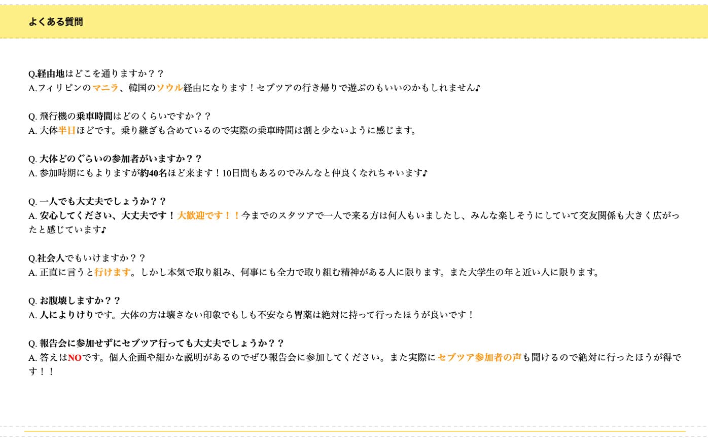 (後期)このサイトを作ったことでツアーの理解度が高まったと報告会で大多数の意見がもらえた。マーケティングの要領でサイト構成を意識して作ったおかげで見やすく楽しんで見れたと言う声もあがった。制作を進めていく中で知る由もなかったセブ島に関する知識が増えてそれをサイト上に落とし込むことができた。このようなツアーのサイトを作ったことにより少しでも行きたい思う又は行ってよかったと声が聞けたらと思う。そして今後はこのツアーの参加者が増えるように色んな制作、活動をしていきたい。