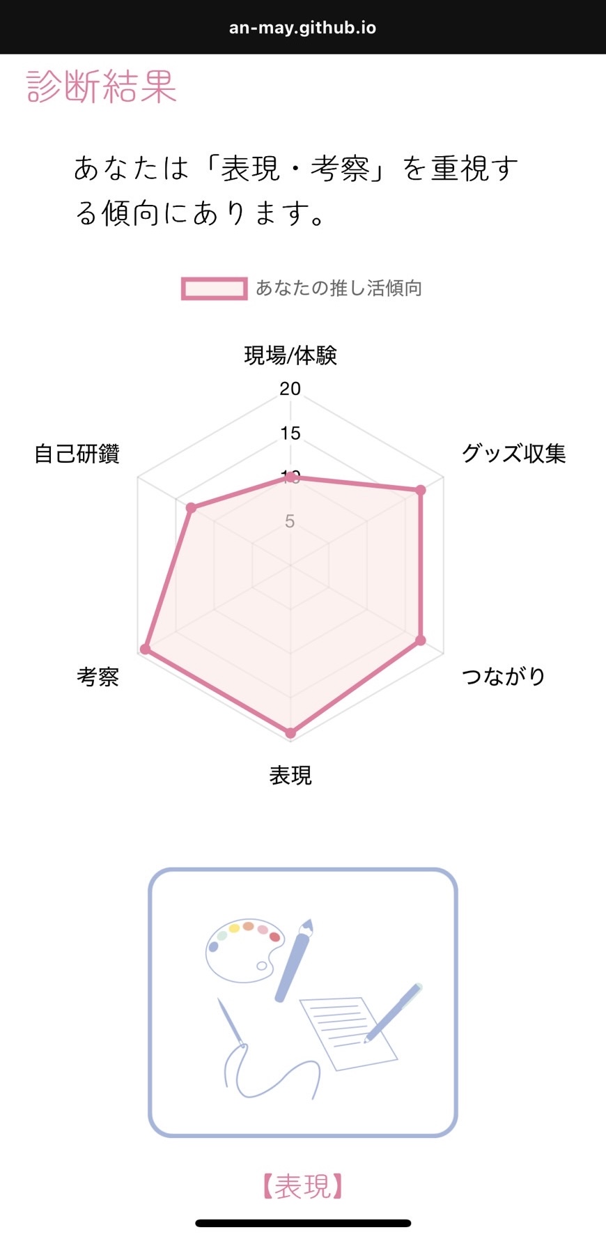 そこで本研究では、推し活における個々の傾向を6つの観点(体験、グッズ収集、つながり、表現、考察、自己研鑽)から診断・可視化するWebコンテンツを開発し、自己理解と多様性の受容を促すことを目的とする。本診断は分類を目的とせず、自分らしい推し活スタイルを見つけるきっかけとなることをめざす。