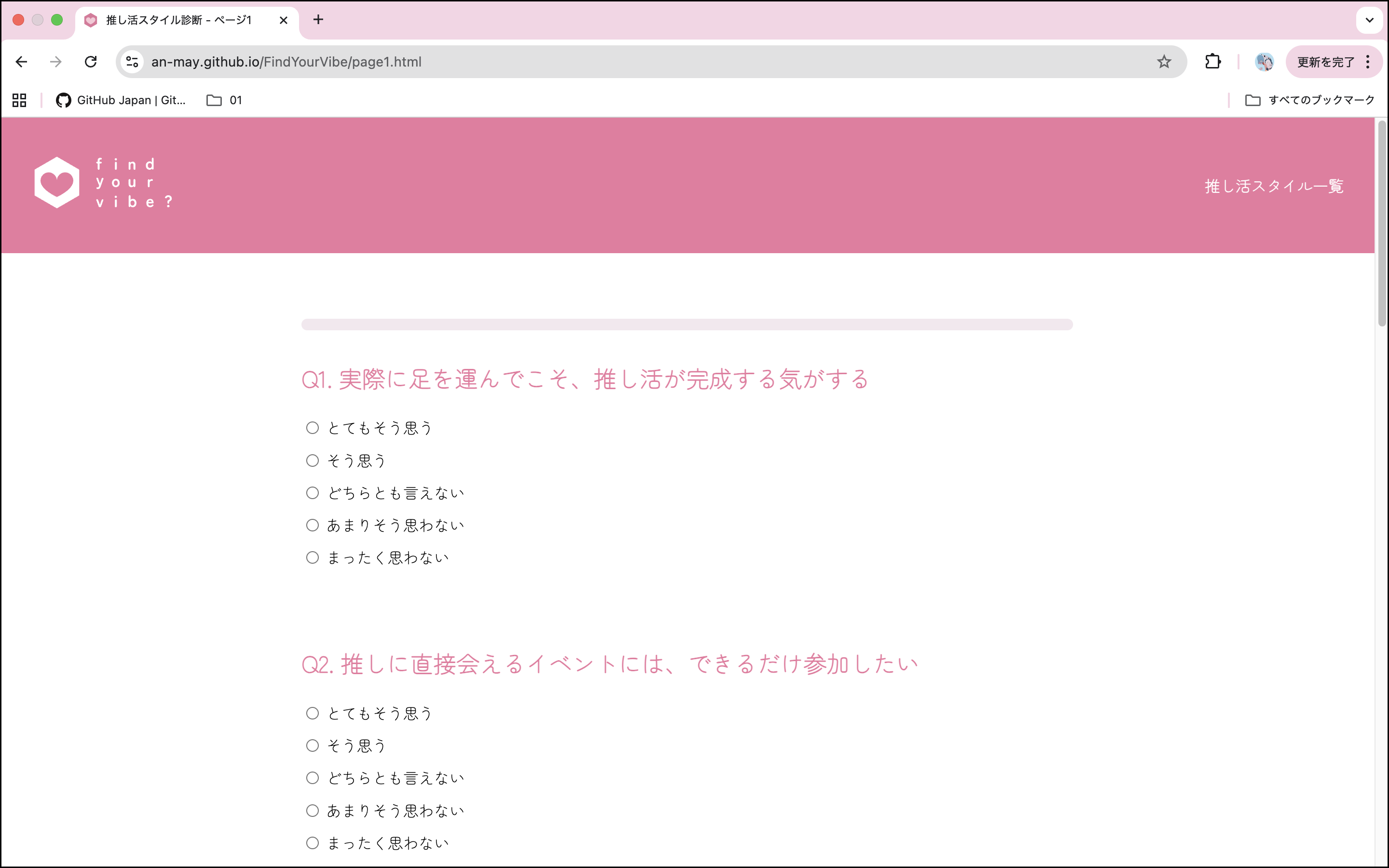 多様な楽しみ方がある“推し活”を、誰かと比べるのではなく、自分自身の価値観・スタイルに目を向けて見つめ直すための診断コンテンツを制作する。サイト全体の雰囲気を柔らかいものにするため、サイトの色はピンクや白をベースにした。また、本研究のタイトルの「Find your vibe」は、「自分の心地よい“ノリ”や“感覚”を見つける」という意味を込めており、他者と比較するのではなく、自分にとって無理のない、自然体で楽しめる推し活のあり方を探してほしいというメッセージを表現している。
