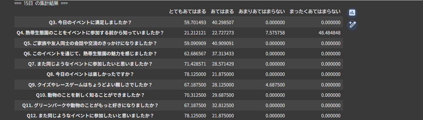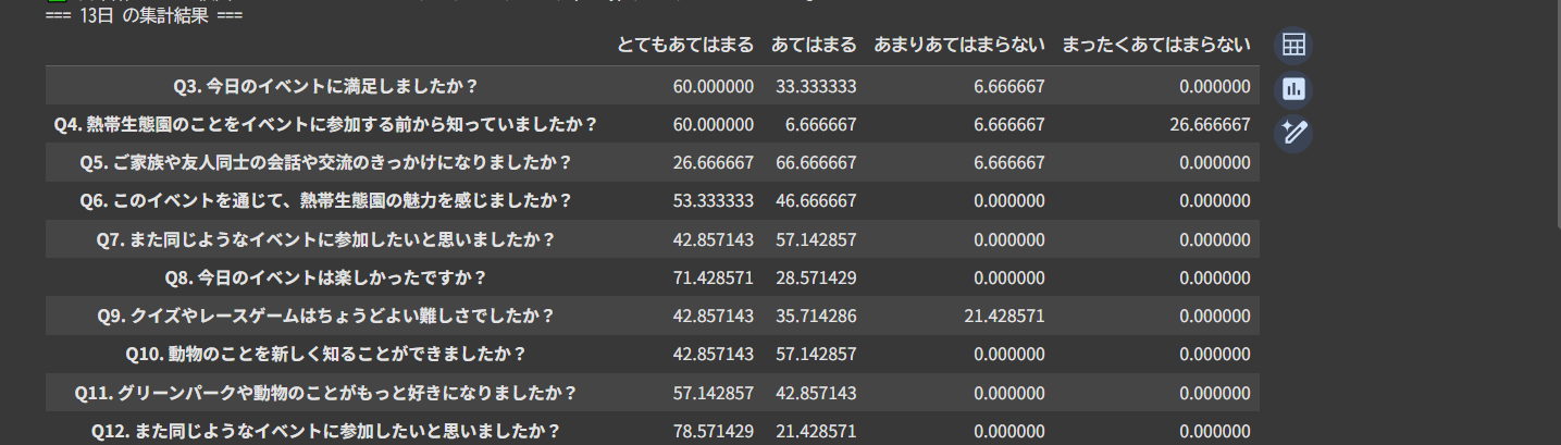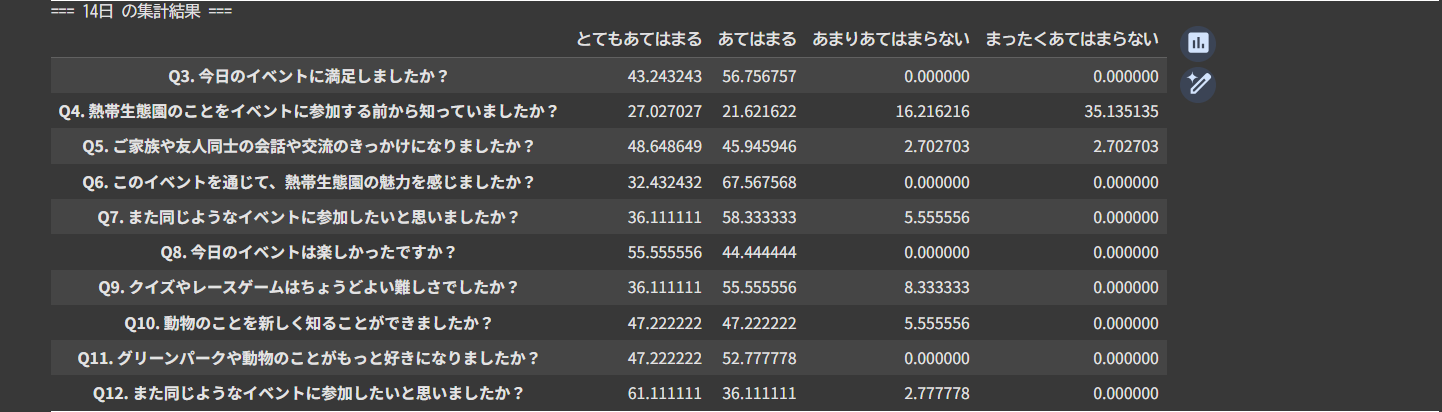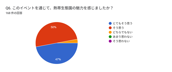実際の来園者の様子からは、家族や友人同士で会話を交わしながらクイズに取り組む姿や、展示物の前で立ち止まり内容を確認する行動が多く観察された。また、アンケート結果においても、動物に関する新たな知識の獲得や、熱帯生態園への再来園意向が確認された。これらの点から、本企画は「自然と知識を深めるきっかけの創出」および「園内回遊を促す仕組みづくり」といった目的に対し、一定の効果を示したと考えられる。