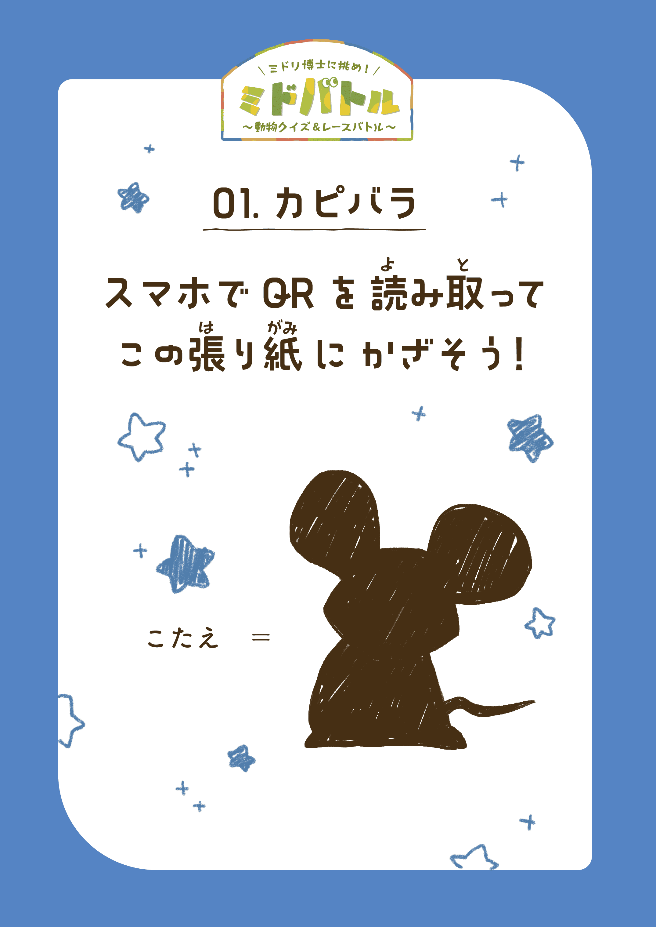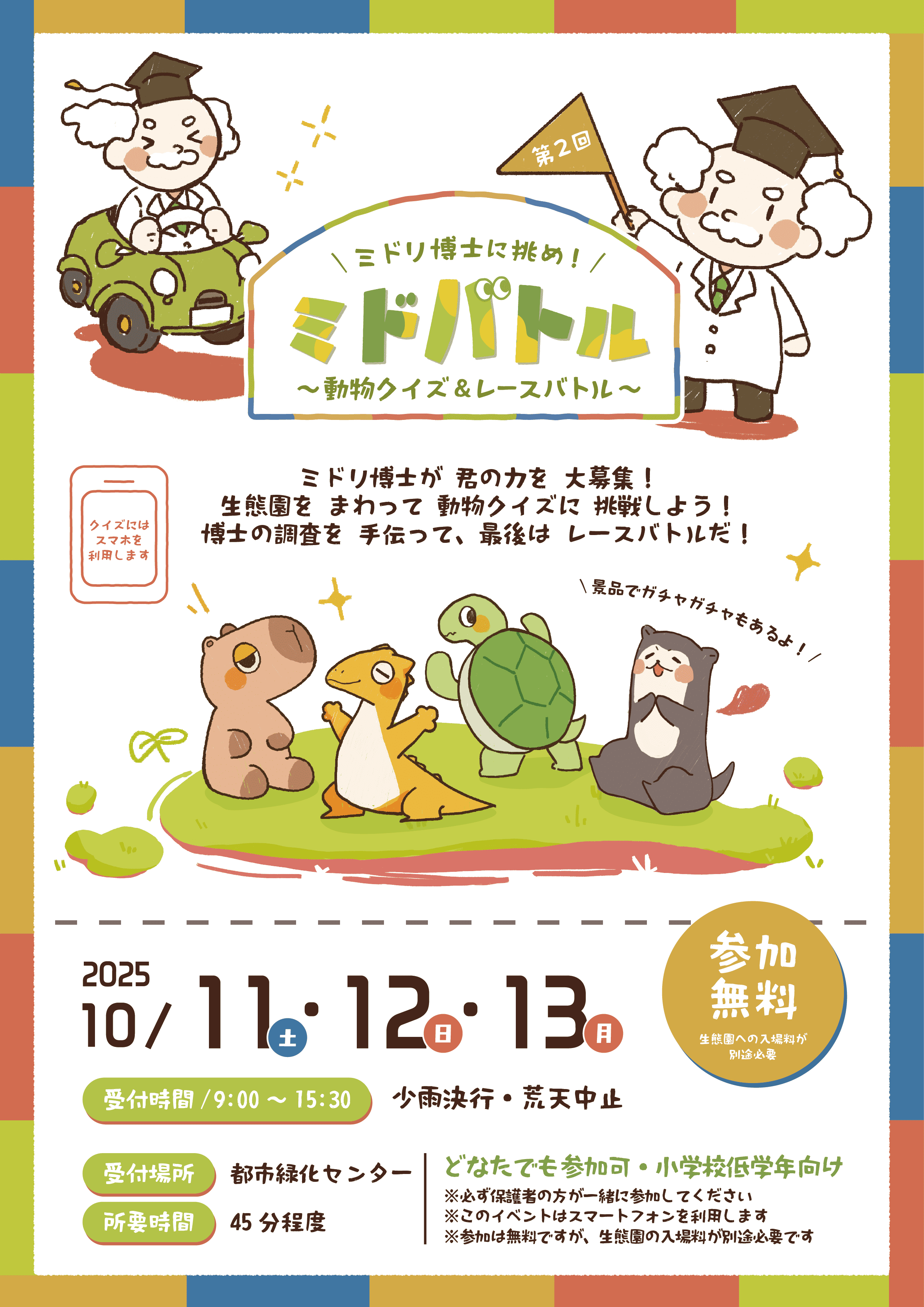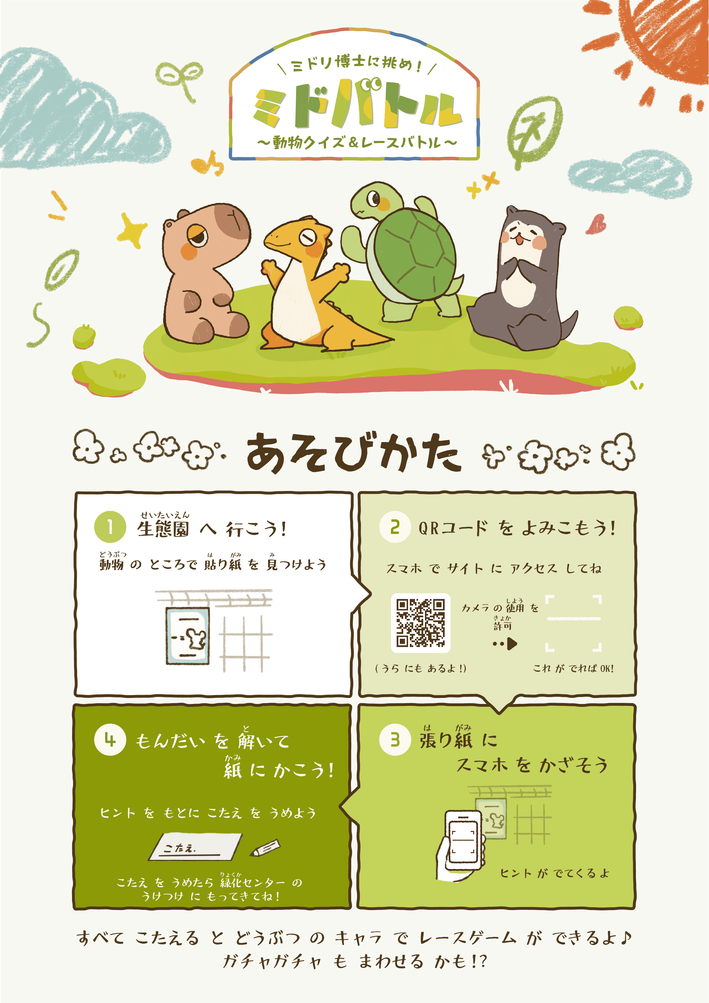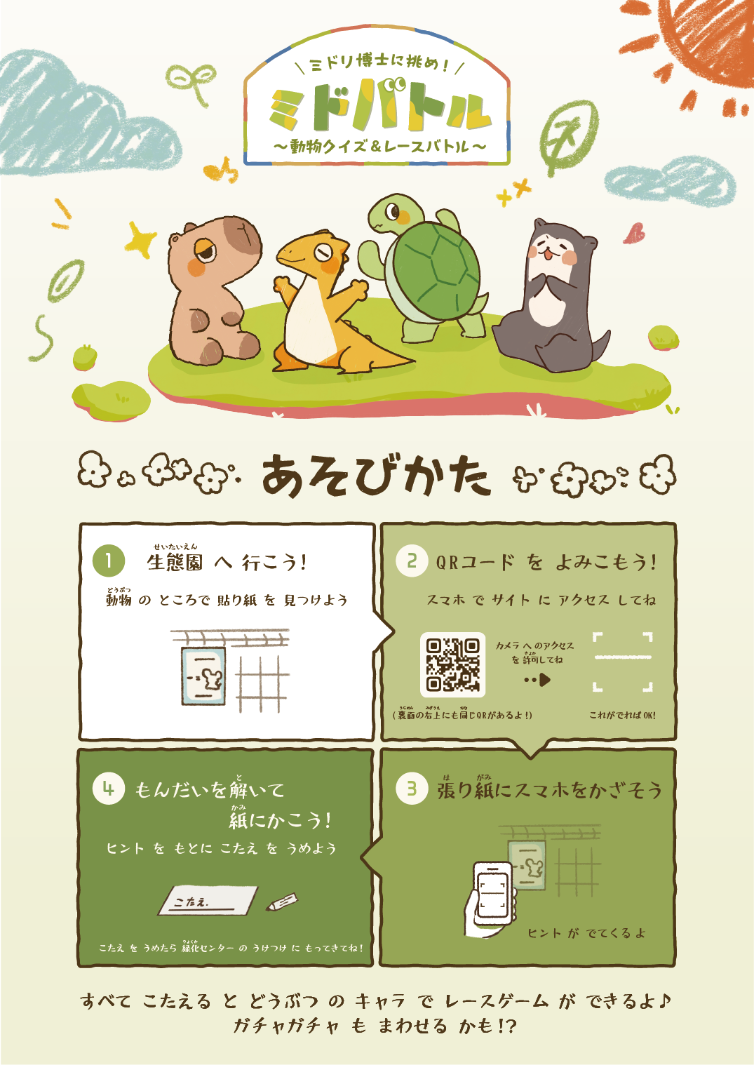 響灘緑地GREEN PARK内にある熱帯生態園を会場にした、小学校低学年向けの体験型イベント。園内を巡って動物クイズに挑戦し、獲得したキャラクターで最後にレースゲームを楽しめる構成となっている。
