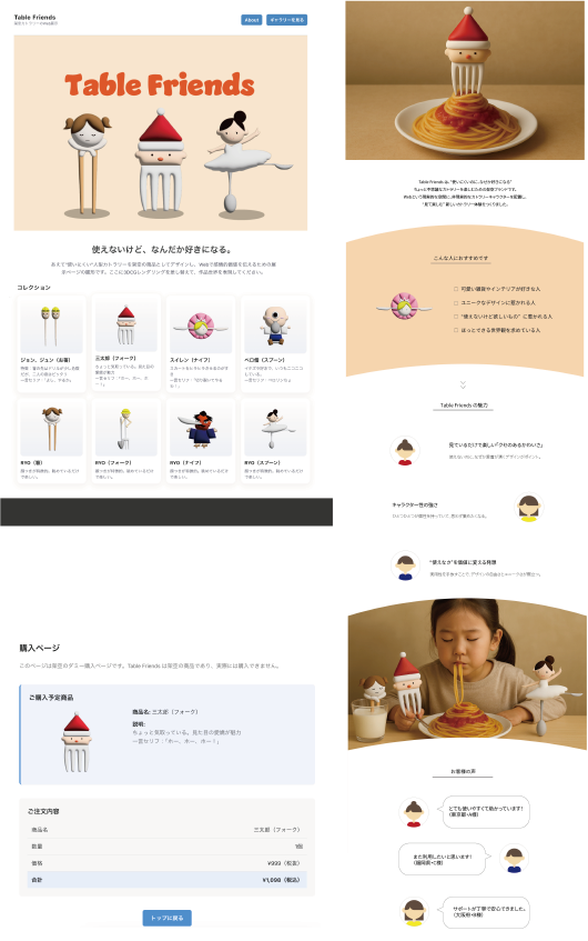 今回の研究では、前期に考えた企画内容をもとに、ビジュアル制作と Web サイトの構築を中心に進めた。特に、人型カトラリーの 3D モデル制作に力を入れ、キャラクター性がより伝わるように形状や色味の調整を行った。