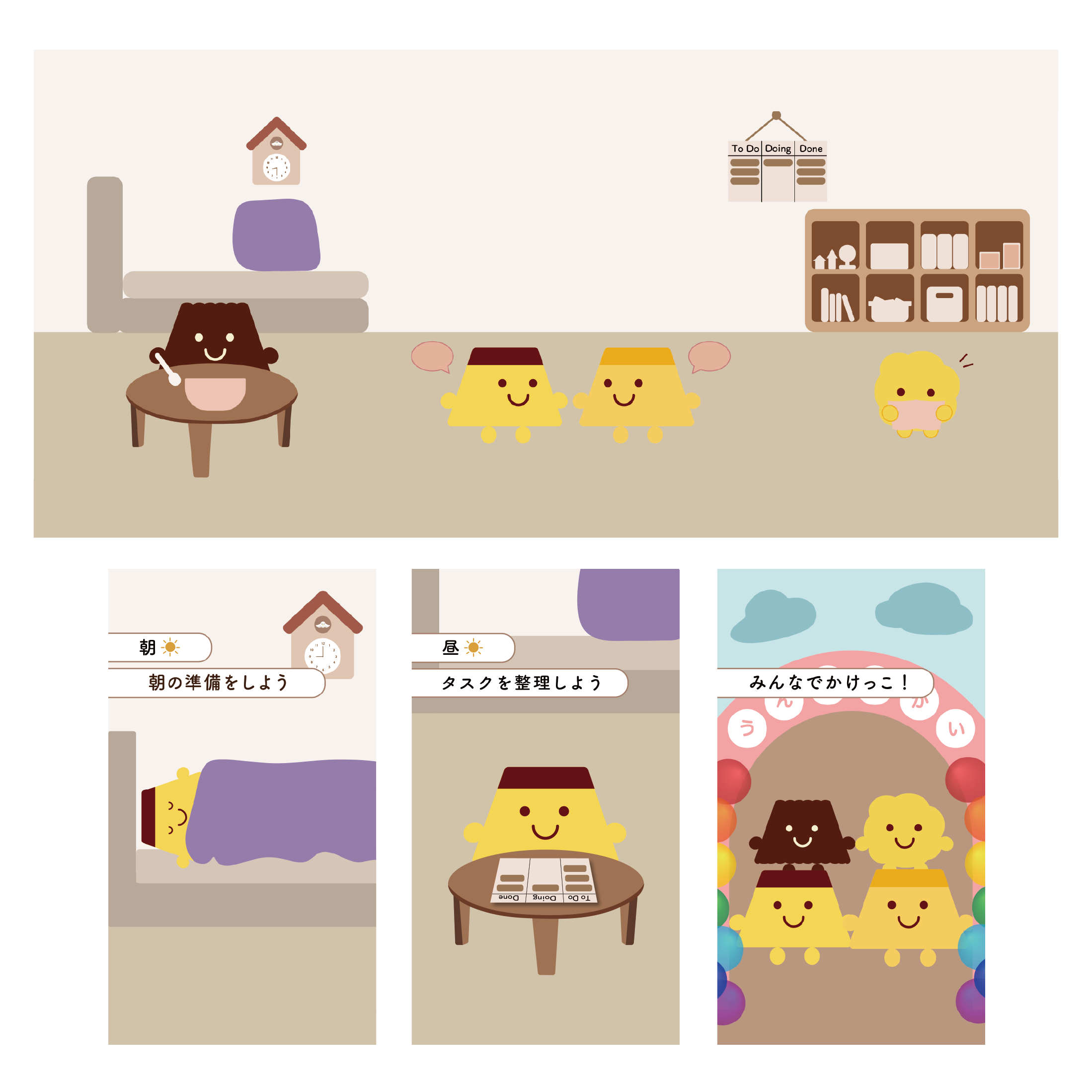 - アニメーション映像と違い横に広いため、ベッドや棚が一気にみえるように工夫した。また、キャラクターが部屋で過ごしている様子を表した。