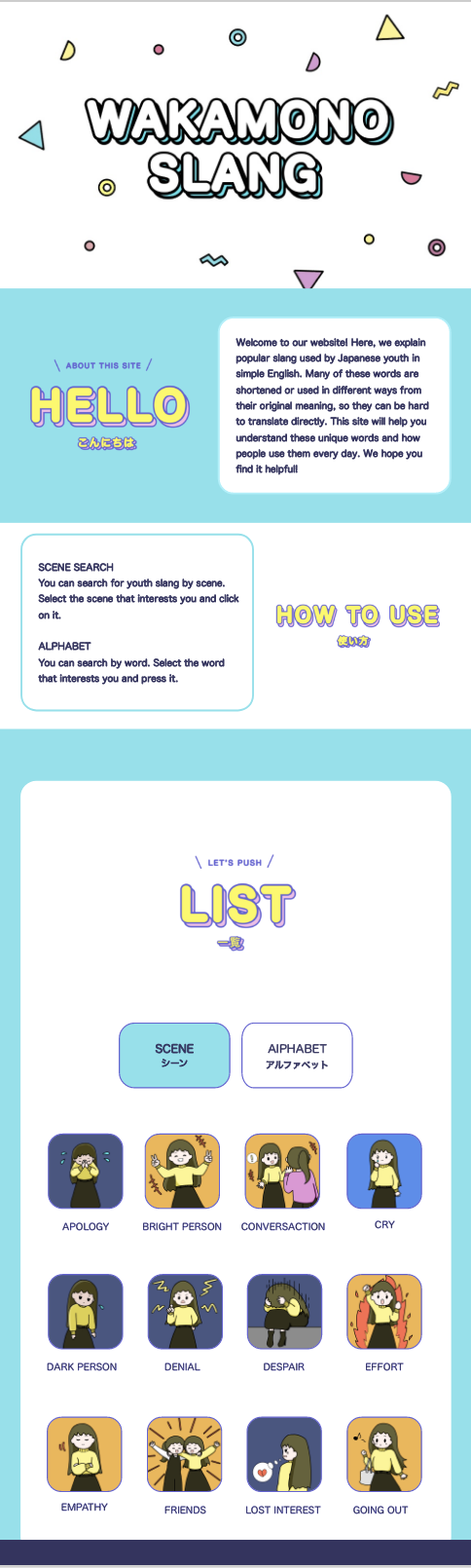 このような現状から、若者の間で流行している言葉の意味を英語で表現し、それらをまとめたWEBサイトを制作することを決めた。本研究では、さまざまな形で生み出されていく若者言葉の意味について、このサイトを通して外国人に理解してもらうことを目指す。