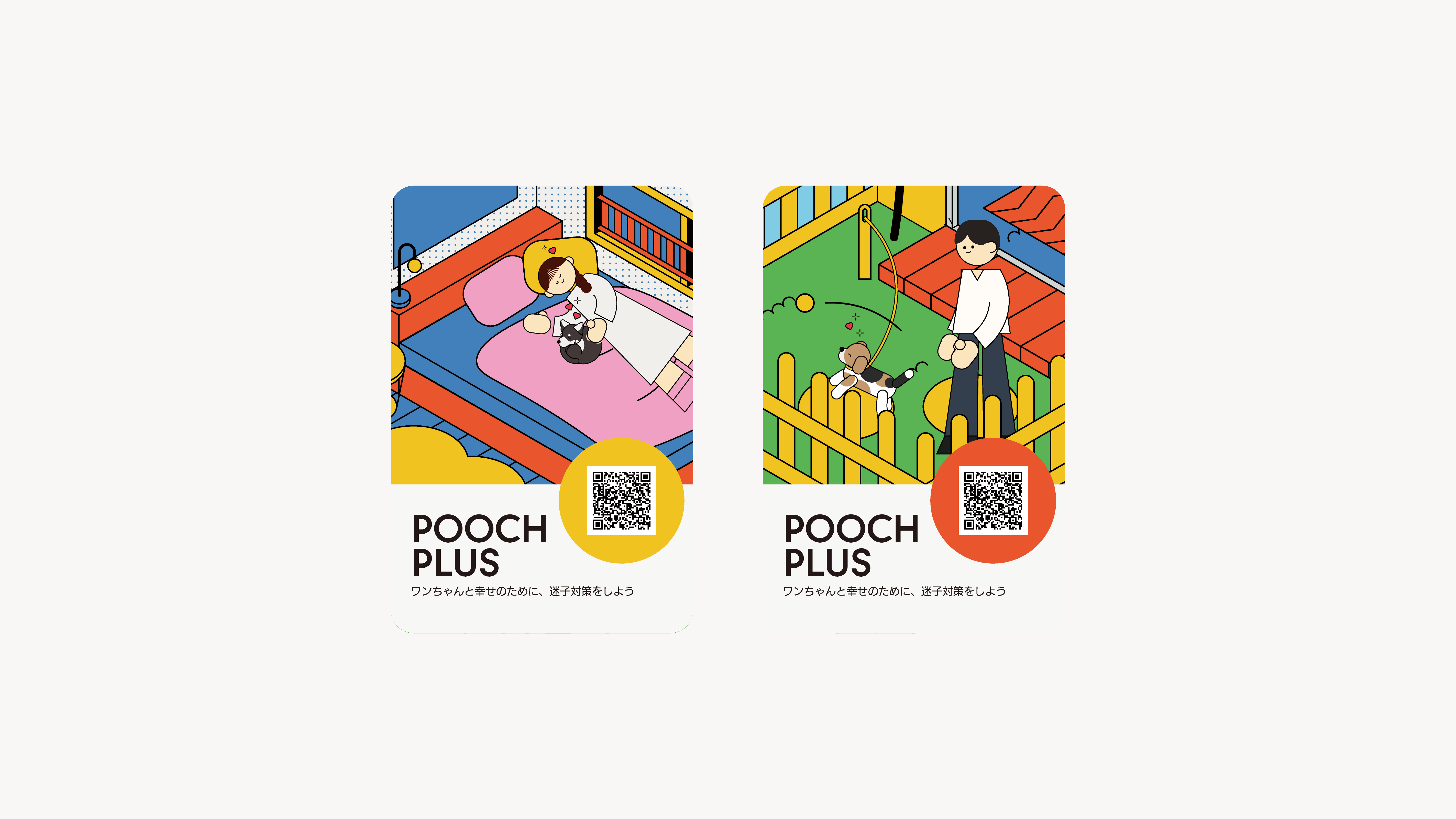 迷子対策をネガティブなイメージで捉えるのではなく、愛犬との生活をより良くするためのポジティブなイメージとして捉えてもらいたいため、ポップな印象のデザインにする。また、犬を飼い始めた人や飼おうと思っている人にもわかりやすいよう、用途に分けてイラストを使用する。
