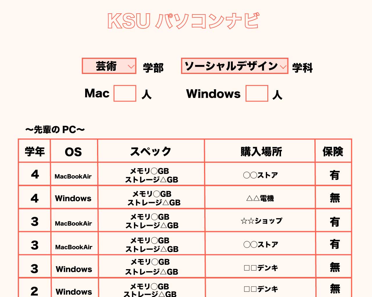 大学に入ってノートパソコンを買うとき、芸術学部の推奨スペックなどを目にしたり聞いたりはしたが、どこで、どのような種類のものを買おうか迷った そこで活用したいのが先輩が使っているパソコンの種類がわかるサイト『KSUパソコンナビ』