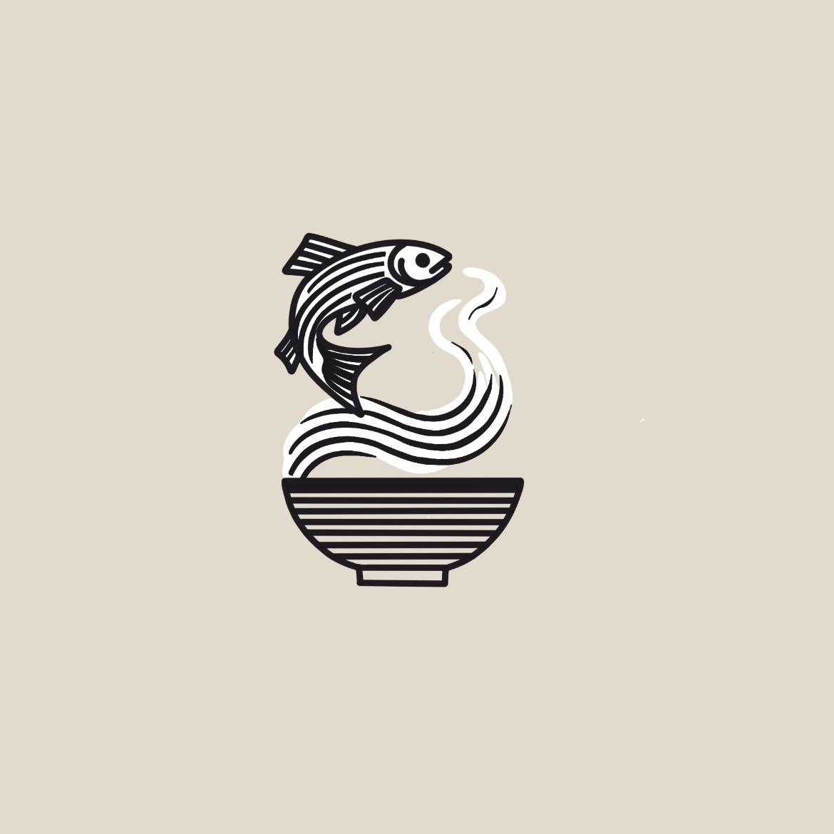 Procreateを使って下絵を制作。このロゴは、飛び跳ねるトビウオを中心に、躍動感と優雅さを兼ね備えたデザイン。波のように流れるうどんの麺にはトビウオの背びれをイメージさせる曲線を組み込み、動きと柔らかさを表現した。また、うどんから立ち上る湯気が徐々にトビウオのシルエットを形作る構成とすることで、料理の温かさと繊細さを調和させた。全体として滑らかなラインを用いることで、自然の美しさと心地よさを感じさせる仕上がりを目指した。