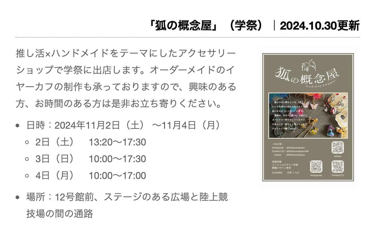 まだ学祭以外で販売するには至っていないが、この研究を 通して作成した VI 計画などをもとに、オーダーメイドのア クセサリー注文ができるようにするなど、今後も『何かを好 き!推している!』と言う気持ちをもった人たちに寄り添え るようなショップのブランディングを行っていきたい。