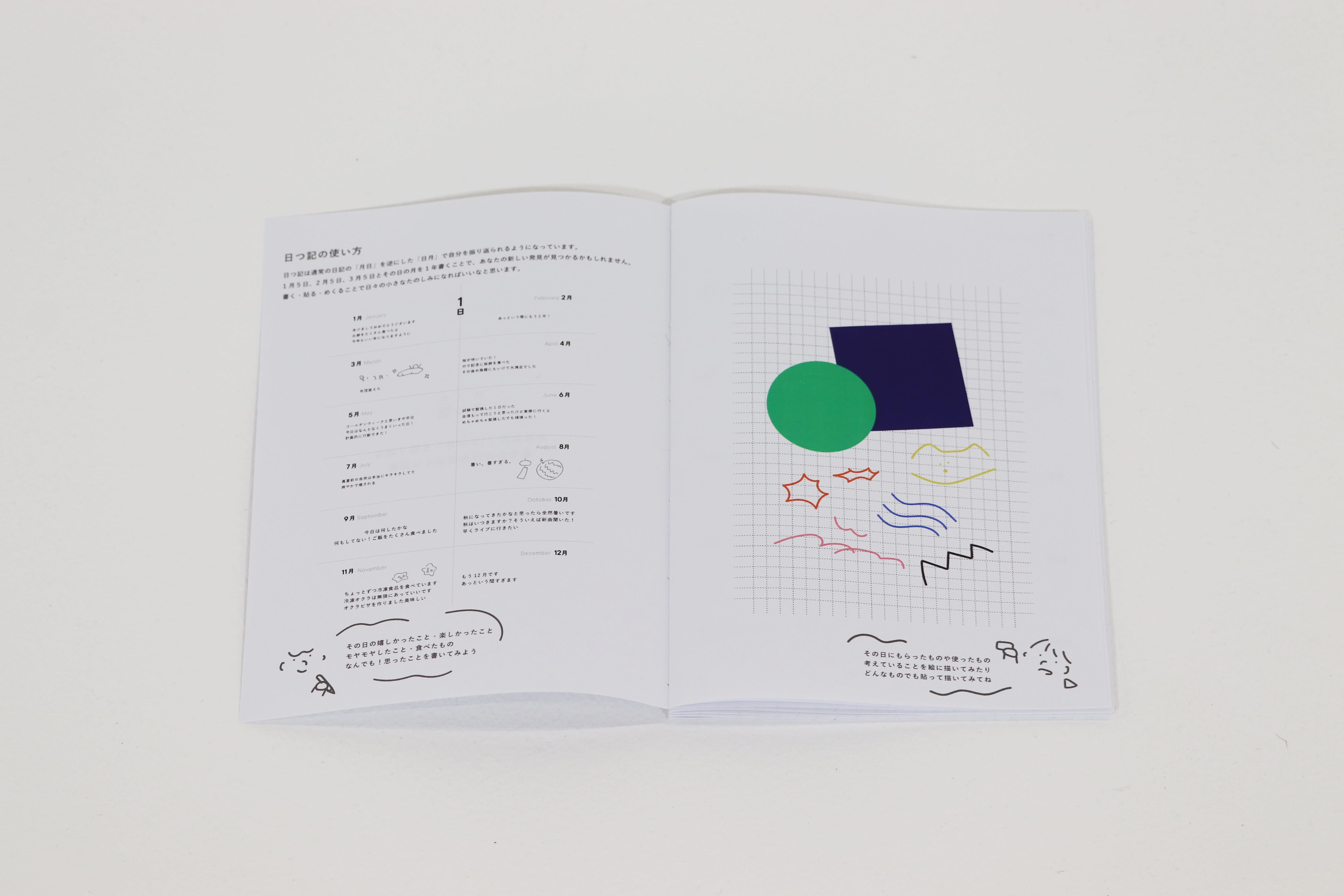同じ日のそれぞれの月を見返しながら、自分の変化や出来事を記録して1年間を振り返ることができる日めくり日記の制作