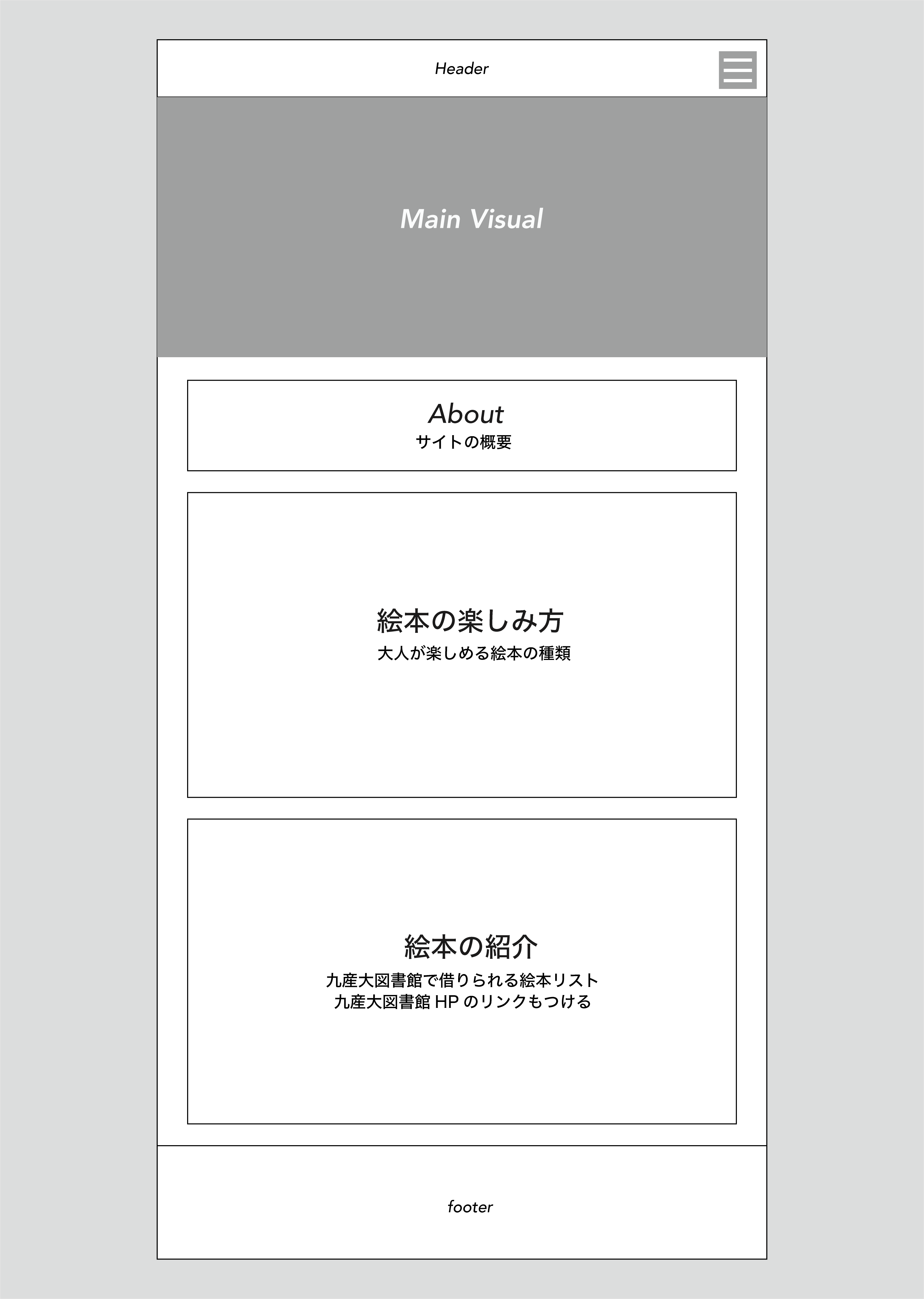 絵本から離れてしまった10代後半から20代の学生に向けて、九産大図書館に蔵書されている約6000冊の絵本の中から、今読んでも面白い、子どもの頃とは違った感じ方ができる絵本を紹介するWebサイトの制作を行う。