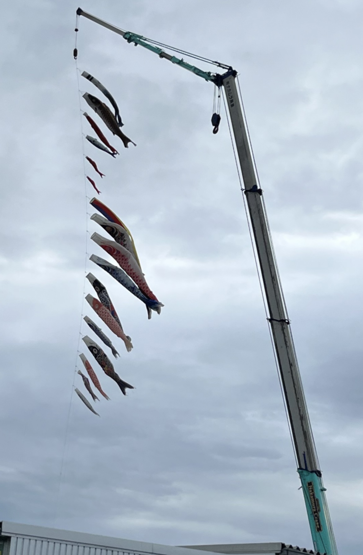 ・クレーンで釣られている鯉のぼり