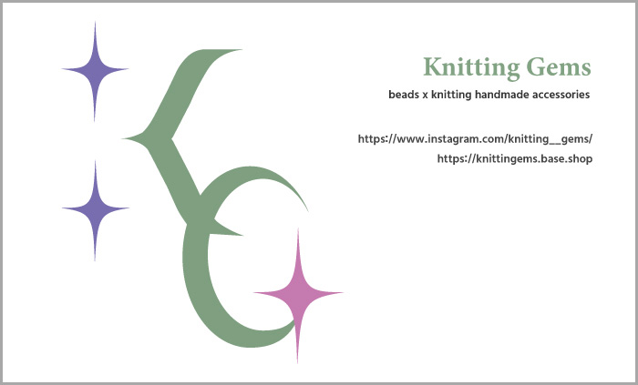 Knitting Gems :「Knitting」はニット、「Gems」は宝石(ビーズ)という意味で、編み物とキラキラとした宝石(ビーズ)の融合がイメージできる。お洒落で、女性的で、可愛いけど可愛すぎない雰囲気を伝えるために、アルファベット表記に決めた。