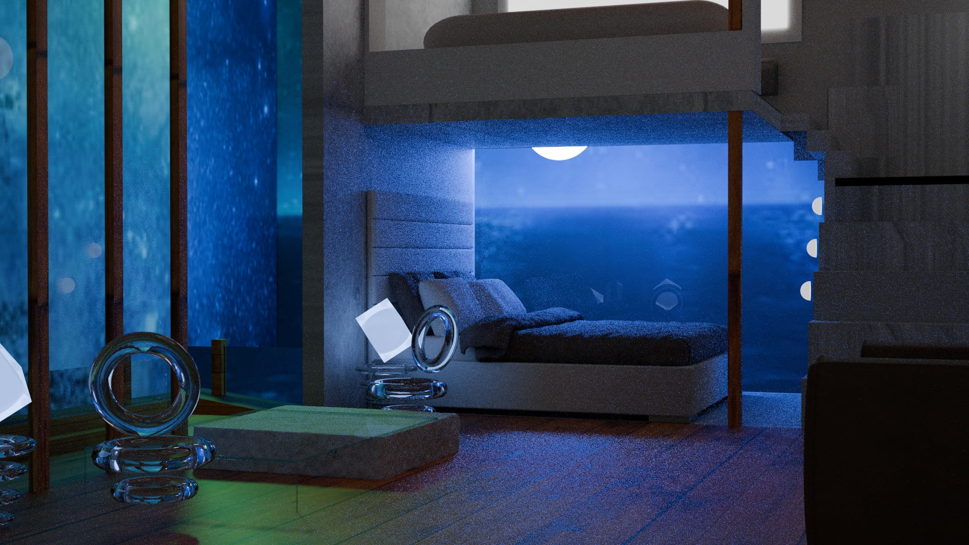 青と緑の光が差し込む家