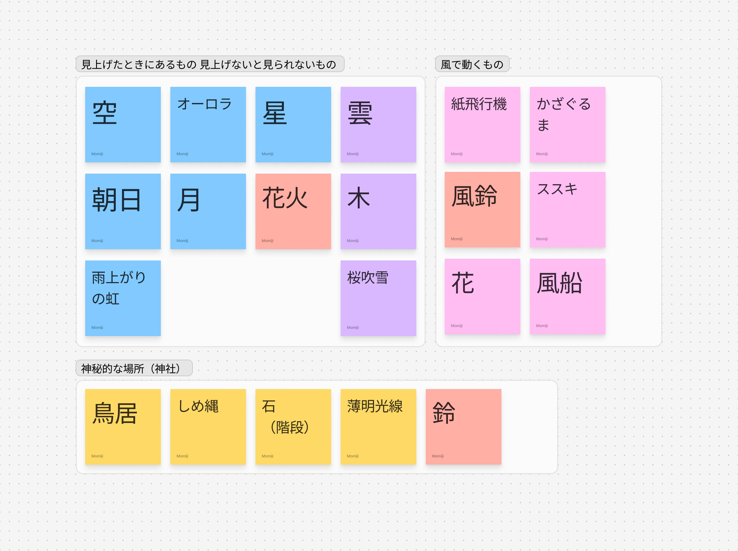 青空、夕焼け空、夜空(月)、雪、花火、桜、木漏れ日、紅葉(落葉)、鳥居