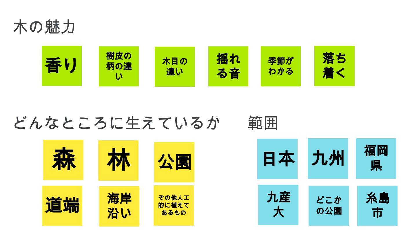 地球上のあらゆる所で当たり前に存在する木。私たちの住んでいる福岡県にも至る所に植えられている。森などに行くと、木に囲まれリラックス効果を得ることができる。さらに、季節を知らせてくれる「時の花」なども存在する。