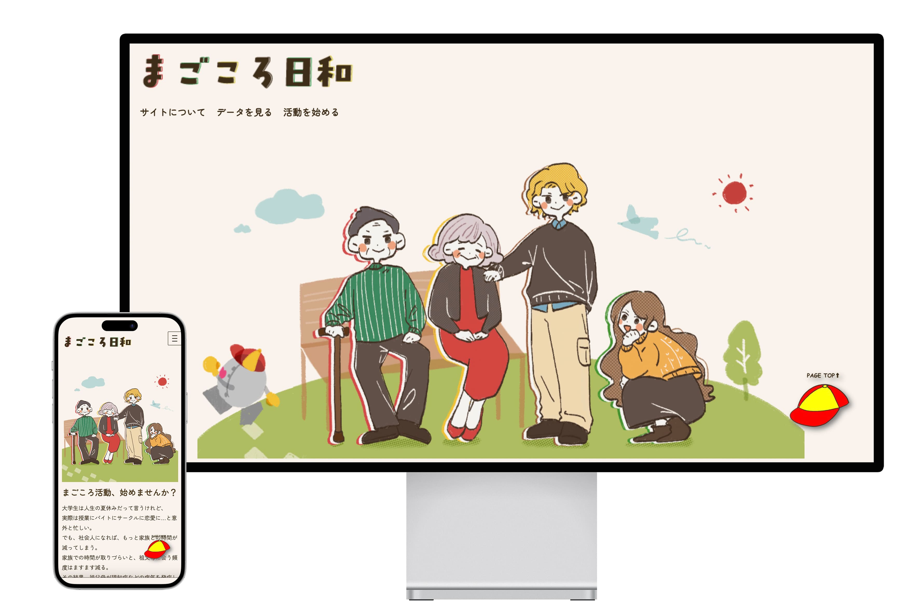 アンケート調査のデータから大学生と祖父母の関わりを見つめ直し、「まごころ活動」を通して、行動のきっかけと継続をサポートするWebサイト。